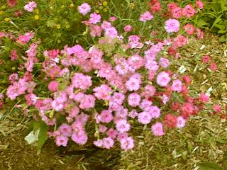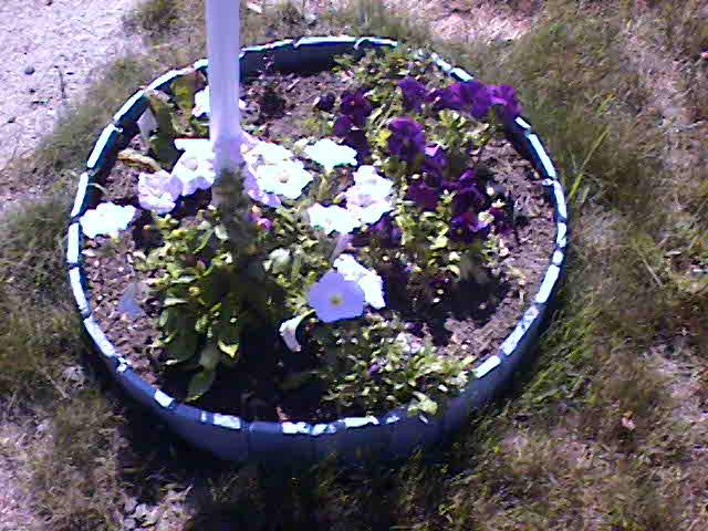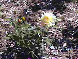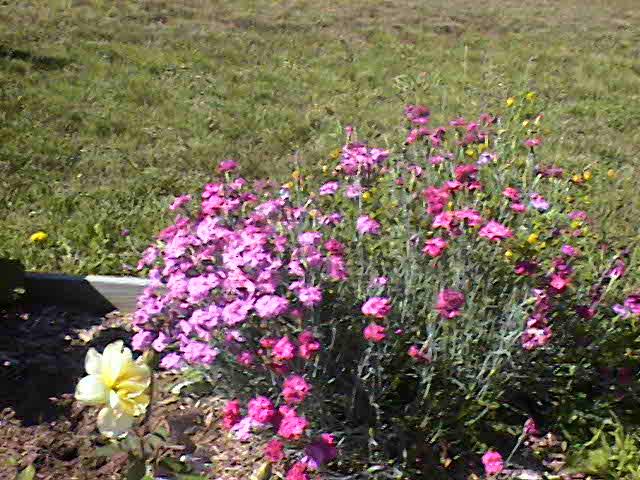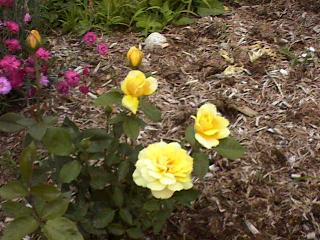 This year I was a little more determined to get something good to grow. I bought a couple of rose bushes, and decided to replant the one I had. I weeded hard for two days, and pulled up all kinds of stuff. I had ground covering clover, wild strawberry plants deep growth grass, and various other hard to pull up plants. It was HARD work. Kinda hard to pull up plants that put down roots every two inches. I finally got it all up, and put down that plastic stuff to keep it from coming back. Planted my five rose bushes, and left spaces for my rhubarb, my pinks, and my peonies. I also have some sweet williams, but I couldn't get all the weeds out from around them, and they were taken over. I am going to have to cover up that last corner, and soon. But not till the heat breaks, or the pool is up. Anyway, this year my peonies finally bloomed, and my roses did wonderfully so far. I was quite excited when I saw my peonies. I LOVE peonies. Then my yellow roses bloomed. Quite profusely too. Last time I looked, I had several buds on different plants I also wanted some blooms in the front of the house, but since it faces north, it doesn't get much sun. So I made a planter around my mail box. Some of the plants did well. others did not. Forthunatly it is still kind of full, and is filling up nicely. Well since I am so excited, I thought I would share.